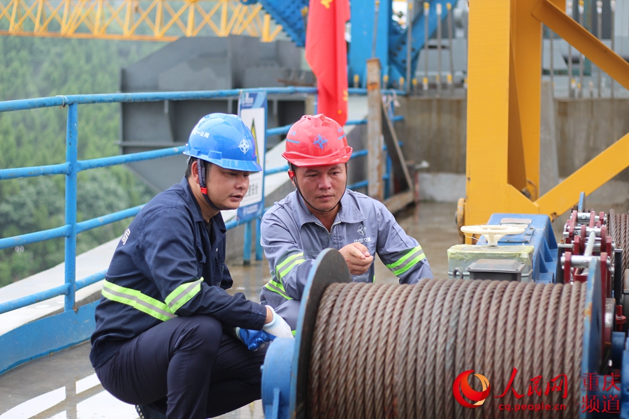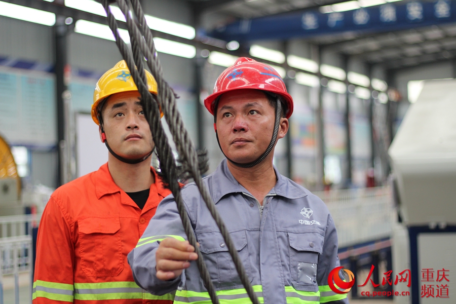 拆裝橫向支撐設備前,李廣輝與工友一同檢查卷揚機的安全性能。中交一公局 供圖